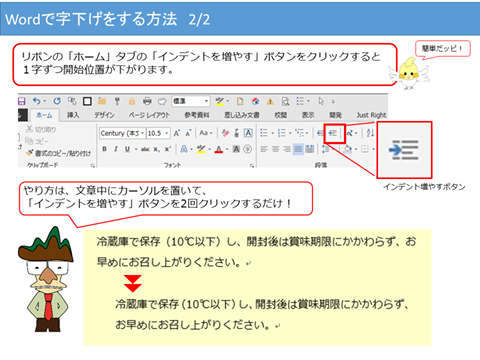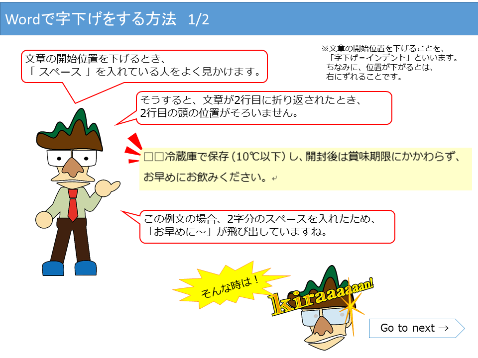 確かに文章が右にずれますが、この方法だと文章が次の行に折り返されたときに、見た目がおかしくなってしまいます。